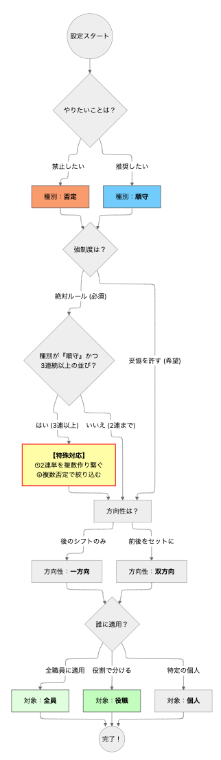 - 効果:全員共通ルールと合わせることで、夜勤の後は「休み」しか選べなくなります。